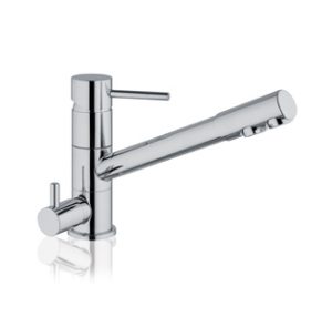 Miscelatore a tre vie meccanico con doccia estraibile. Dotato di aeratore antibatterico sull’uscita dell’acqua filtrata.